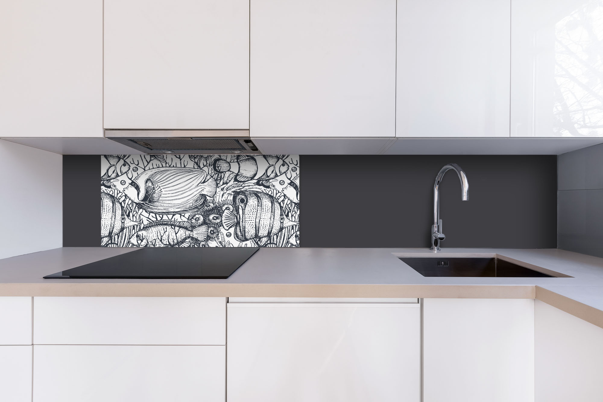 Dibond obkladová doska za kuchynskú linku Čiernobiele ryby - 80 x 40 cm