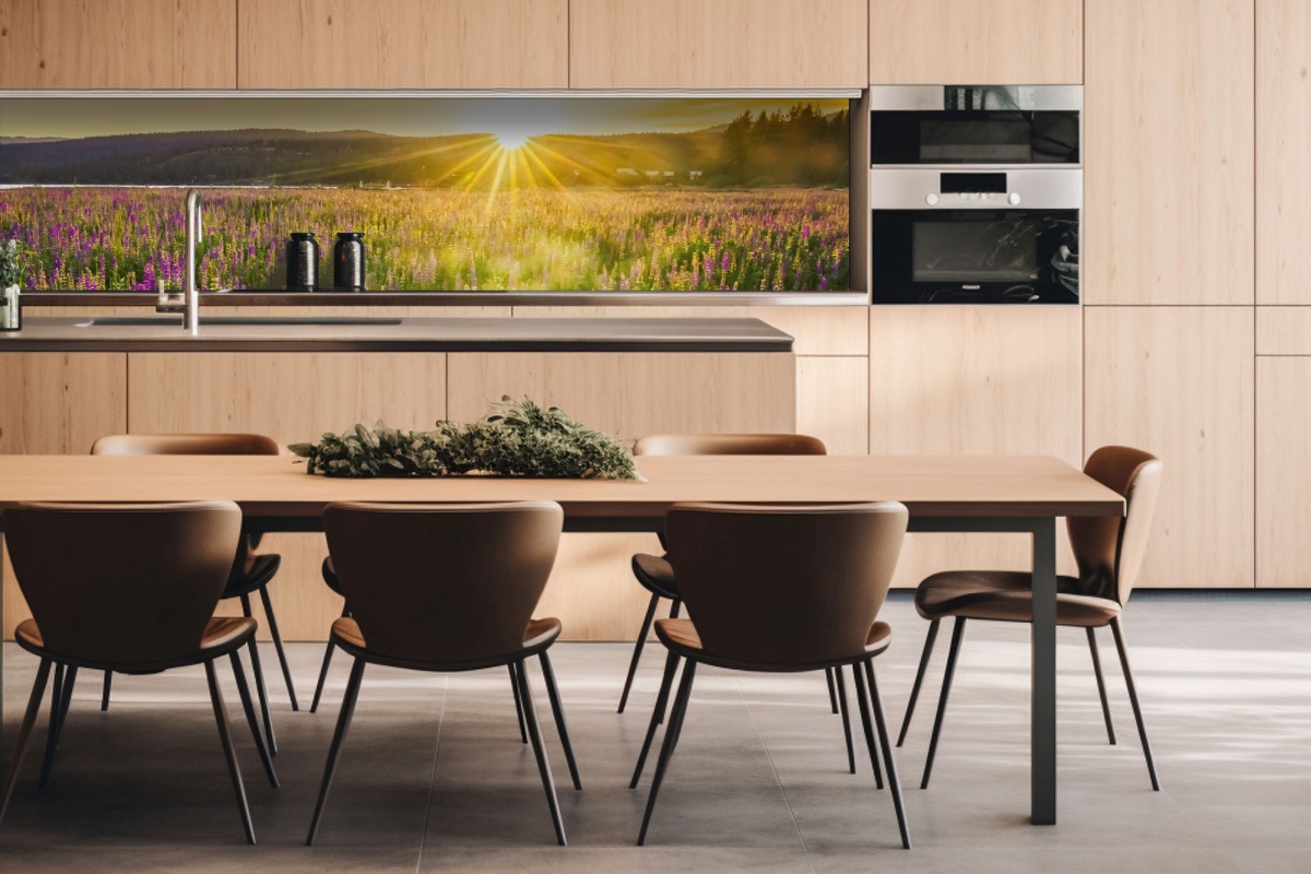 Dibond obkladová doska za kuchynskú linku Slnečné lúče nad lúkou - 260 x 60 cm